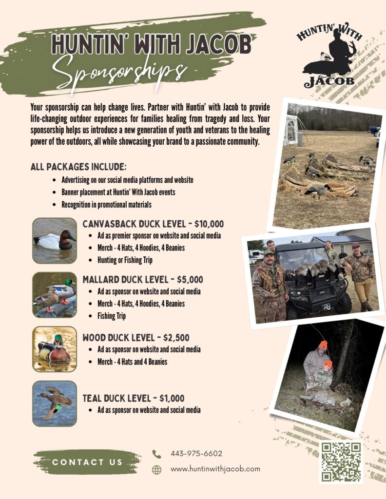 Your sponsorship can help change lives. Partner with Huntin’ With Jacob to provide life-changing experiences for families healing from tragedy and loss. Your sponsorship helps us introduce a new generation of youth and veterans to the healing power of the outdoors, all while showcasing your brand to a passionate community.
