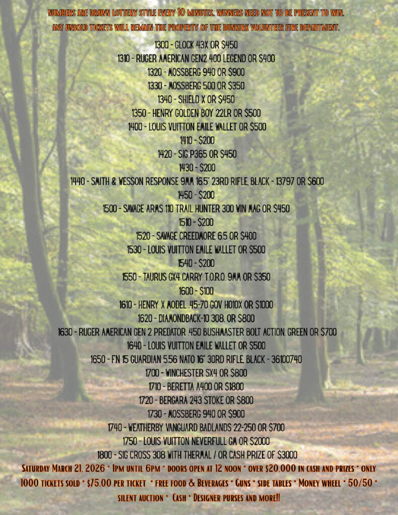 A 50/50 raffle is one of the easiest ways to get in on the excitement during the Sportsman’s Bash. Participants purchase raffle tickets throughout the event, and all ticket sales go into one growing prize pot. At the end of the raffle, one lucky ticket is drawn — and the winner takes home 50% of the total cash collected. The remaining 50% will be split between Dunkirk Volunteer Fire Department and Huntin’ with Jacob.